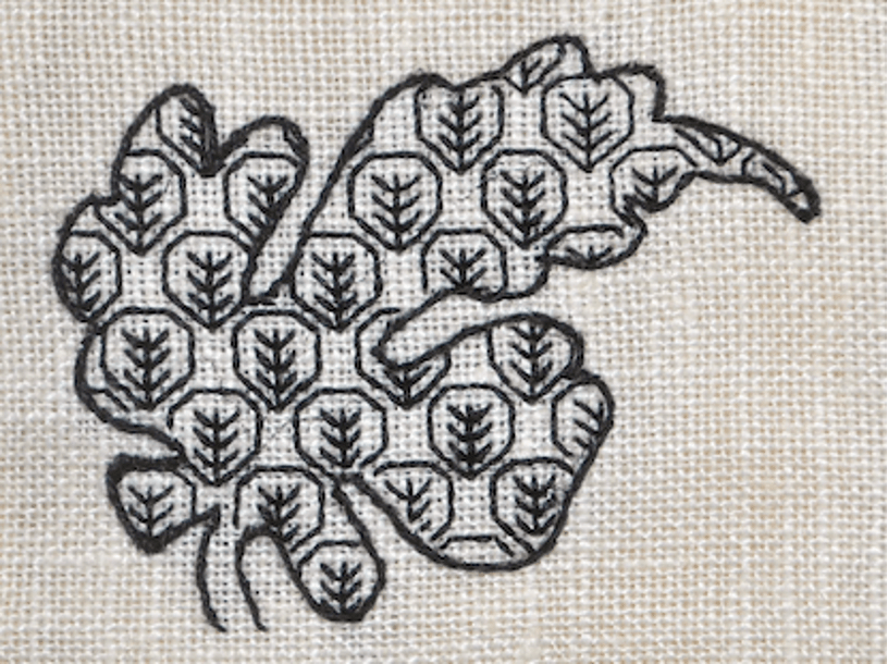 This month I also decided to bite the bullet and stitch the pattern inside a shape, which is what it’s meant for after all. Using a very fine Pigma Micron pen, I drew the outline of a leaf from “Cray” by William Morris onto 30 Count Legacy linen. I then stitched the filling pattern inside the shape using 1 strand of black Soie d’Alger, and outlined it with stem stitch.