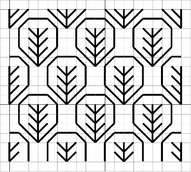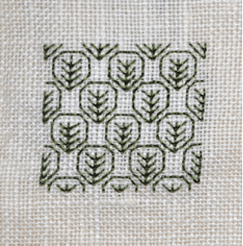 This pattern was created by repeating a little fan (or leaf?) that I extracted from a larger motif in Blackwork Made Easy by Lesley Wilkins. In the diagram, 1 grid square equals 1 square on Aida or 2 threads on evenweave / linen. The sample is stitched with 1 strand of DMC 3051 (Dark Green Grey) on 30 count Legacy linen.