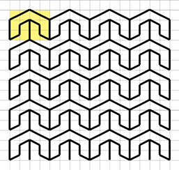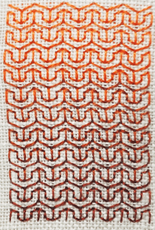 Sashiko, a traditional form of Japanese embroidery using the running stitch, is a great source of inspiration for blackwork. Both techniques employ geometric patterns, and both rely on the contrast between the embroidery and the ground cloth – although Sashiko is not counted and typically uses white thread on indigo fabric. This month’s blackwork pattern was adapted from a Sashiko pattern called Mukai kikkō (facing tortoiseshell), which gives an almost 3D effect. In the diagrams, 1 grid square equals 2 threads on evenweave / linen. The repeat is highlighted in yellow.