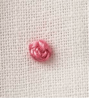 A good knot depends on keeping a good tension on the thread, allowing enough space between entry and exit stitches so that the knot sits neatly on the fabric, and mastering the art of how tight to pull it. Size can be varied by the thickness or number of strands of thread, or the number of wraps. 2-3 is usual.